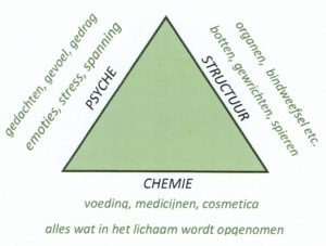 Vanuit de kinesiologie wordt er gewerkt met een beeld van de driehoek van gezondheid, waarbij elke zijde van de driehoek even lang is. De drie delen zijn:
